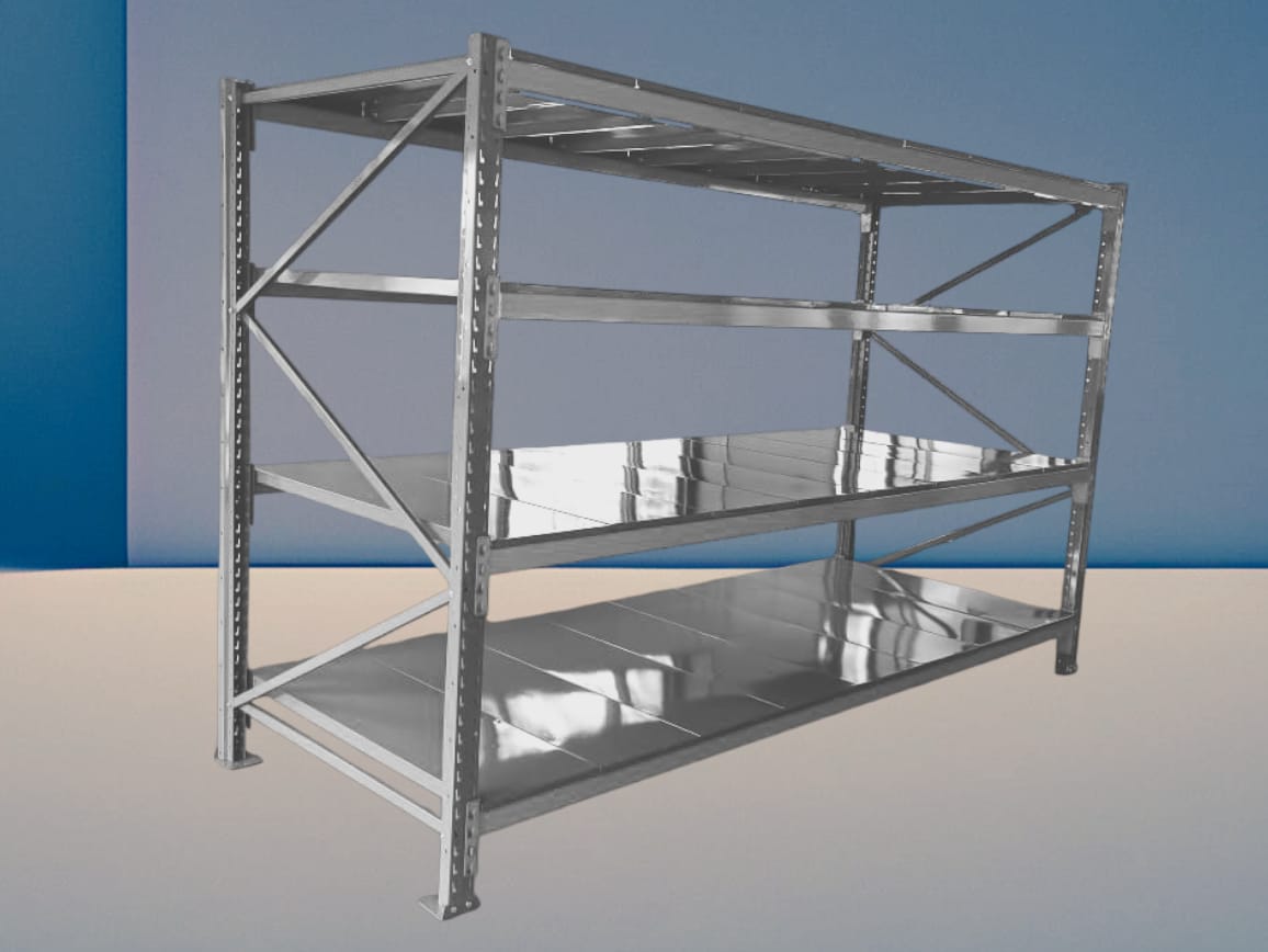 Stainless Steel Long Span Shelving Racks are storage solutions constructed from stainless steel, designed to accommodate a wide range of items without the need for pallets. They feature long, sturdy beams supporting adjustable shelves, providing efficient and accessible storage for various industries.